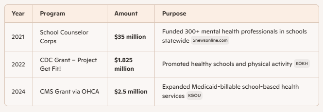 Since Superintendent Joy Hofmeister’s tenure, Oklahoma has secured at least $39.3 million in funding related to school-based health services and mental health infrastructure. Here’s a breakdown of the major funding streams tied to SBHC (School-Based Health Centers) and related initiatives: